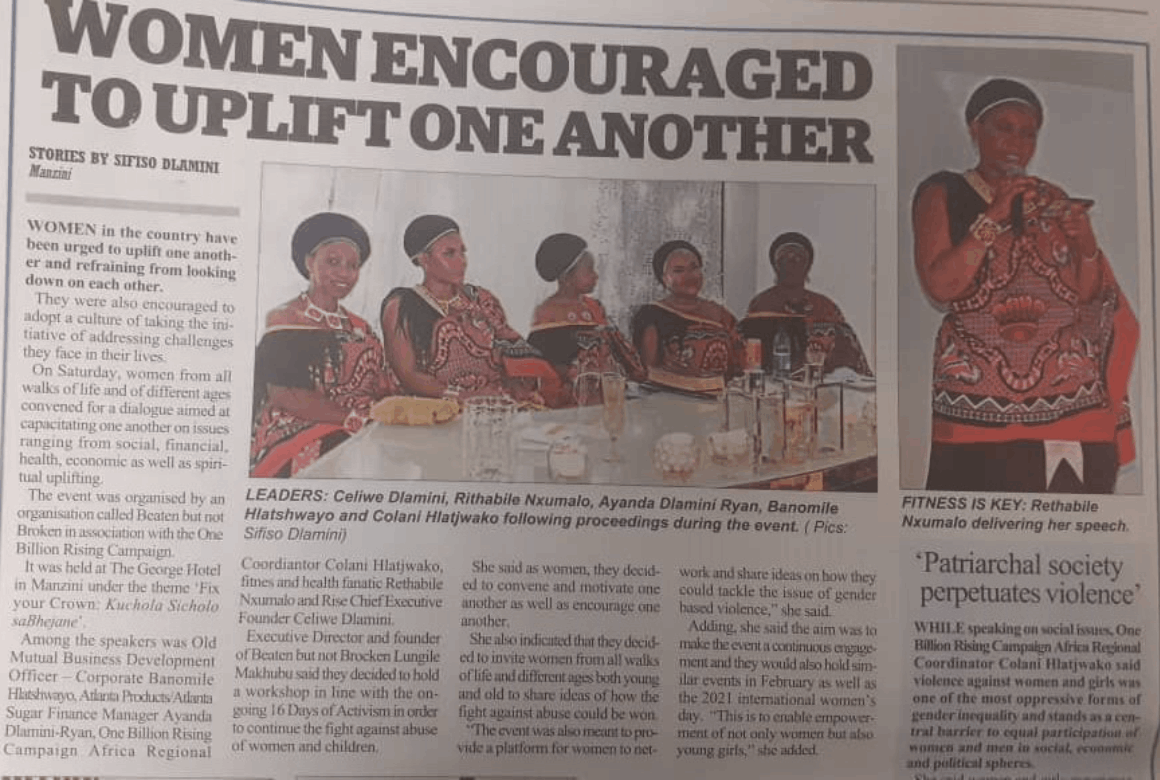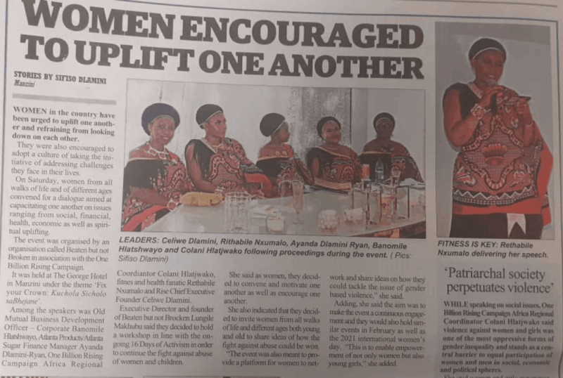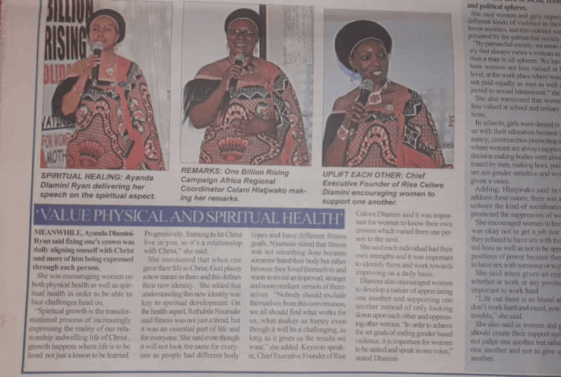 Fix Your Crown, is an initiative encompassing an annual luncheon event focused on the empowerment of women and young girls supported by RISE. In 2020, RISE Chief Executive Founder Celiwe Dlamini, was the Keynote Speaker where she delivered her humanitarian title rendition “Utsite Celiwe Sibokuvusela”
